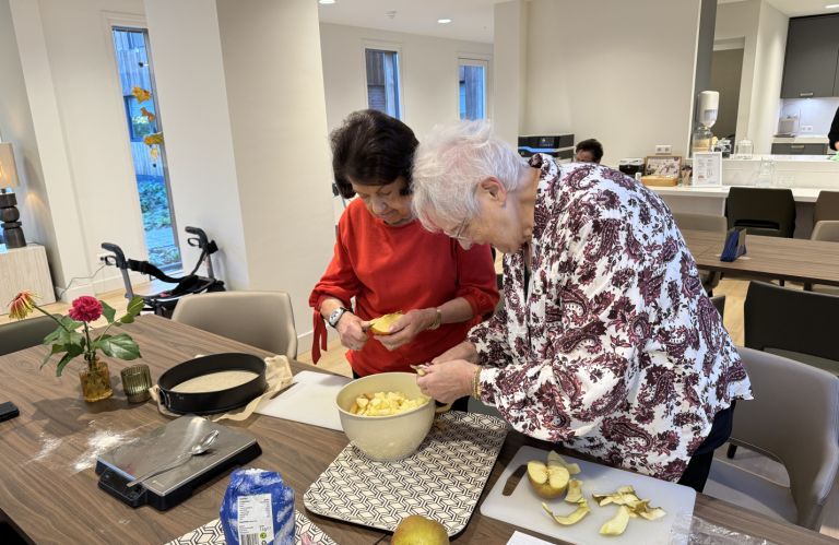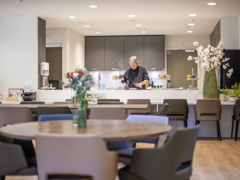 Elke kleinschalige woonvoorziening voor ouderen is zodanig ingericht dat het dagelijkse leven centraal staat. Bewoners hebben hun eigen zorggeschikte studio die ze naar wens kunnen inrichten, met eigen meubels, foto's en herinneringen. De gezamenlijke ruimtes zijn warm en uitnodigend. We koken samen, eten samen en beleven samen de dag. Dat is de kracht van een kleinschalige woonvorm.
